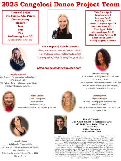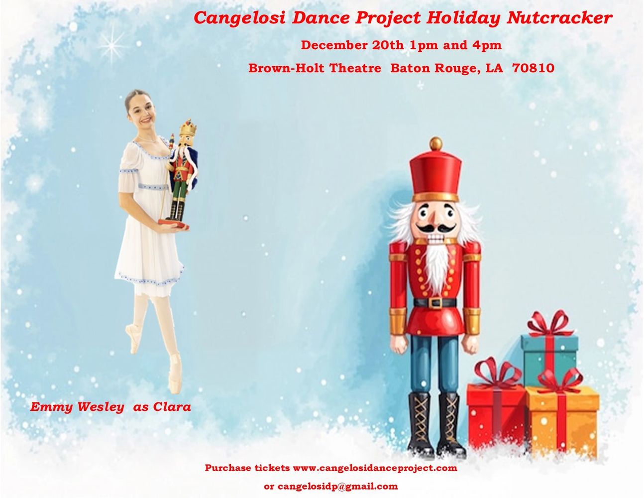 The Cangelosi Dance Project Holiday Nutcracker under Artistic Director/Choreographer Kris Cangelosi will be held December 20th with two shows 1pm and 4pm held at Brown-Holt Theatre in Baton Rouge. LA. This year we have invited professional ballerina from Ballet Spartanburg Maddie Kucensky to perform Sugar Plum Fairy, and professional danc