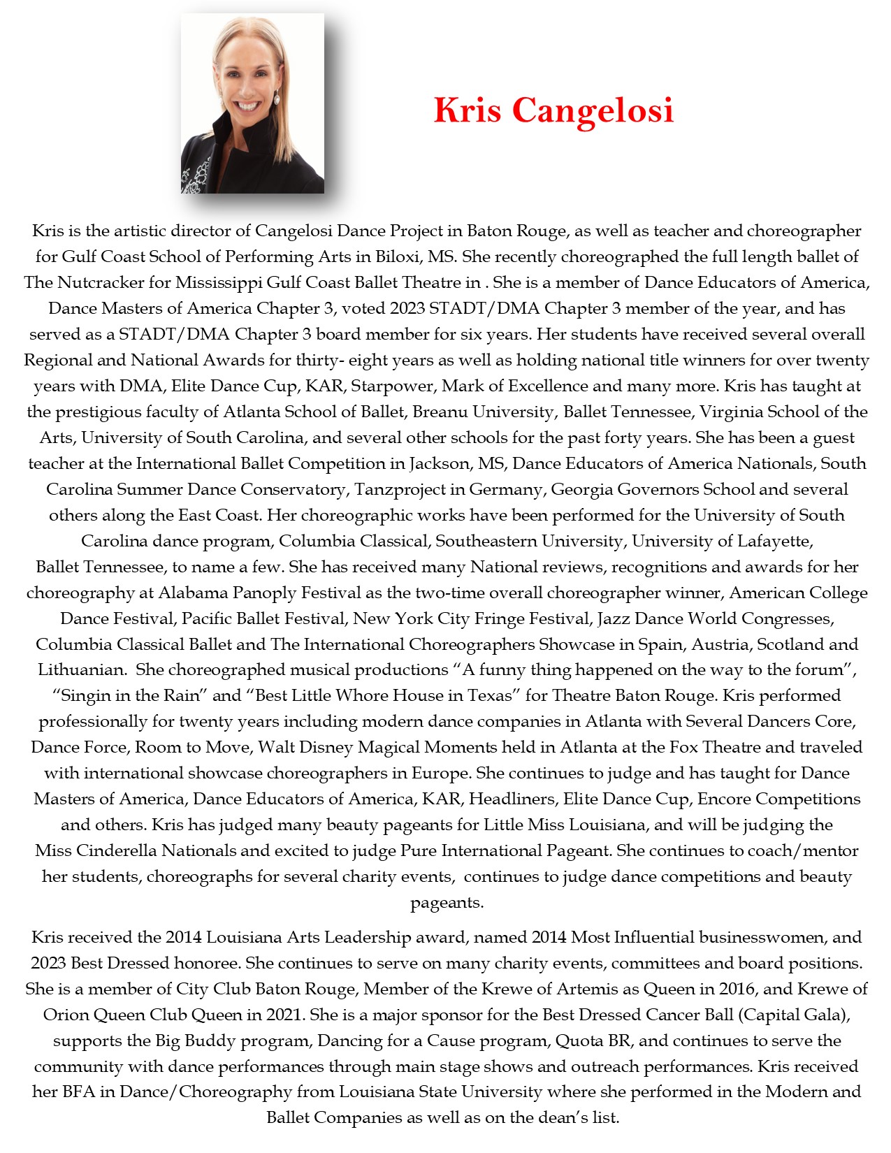 Kris Cangelosi teaches classes, privates and workshops in Classical Ballet to students from Baton Rouge throughout the Gulf Coast area. In addition, her students are given many performance opportunities!